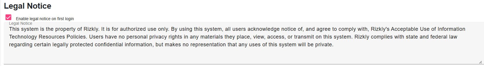 You can set a Legal Notice to appear for a user’s first login in the Account Profile Settings.