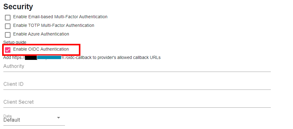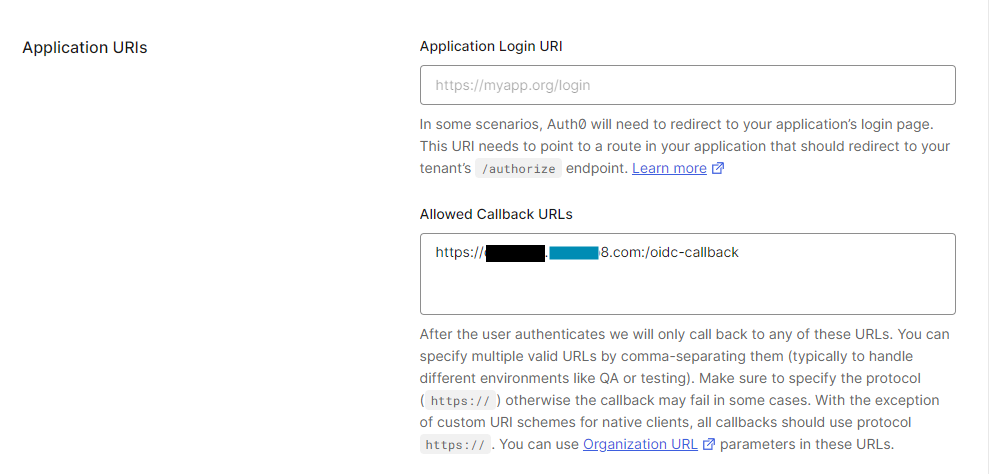 The Authority (Domain), Client ID, and Client Secret fields will come from your SSO provider. In the field of your SSO provider, add the top link to the allowed callback URLs.
